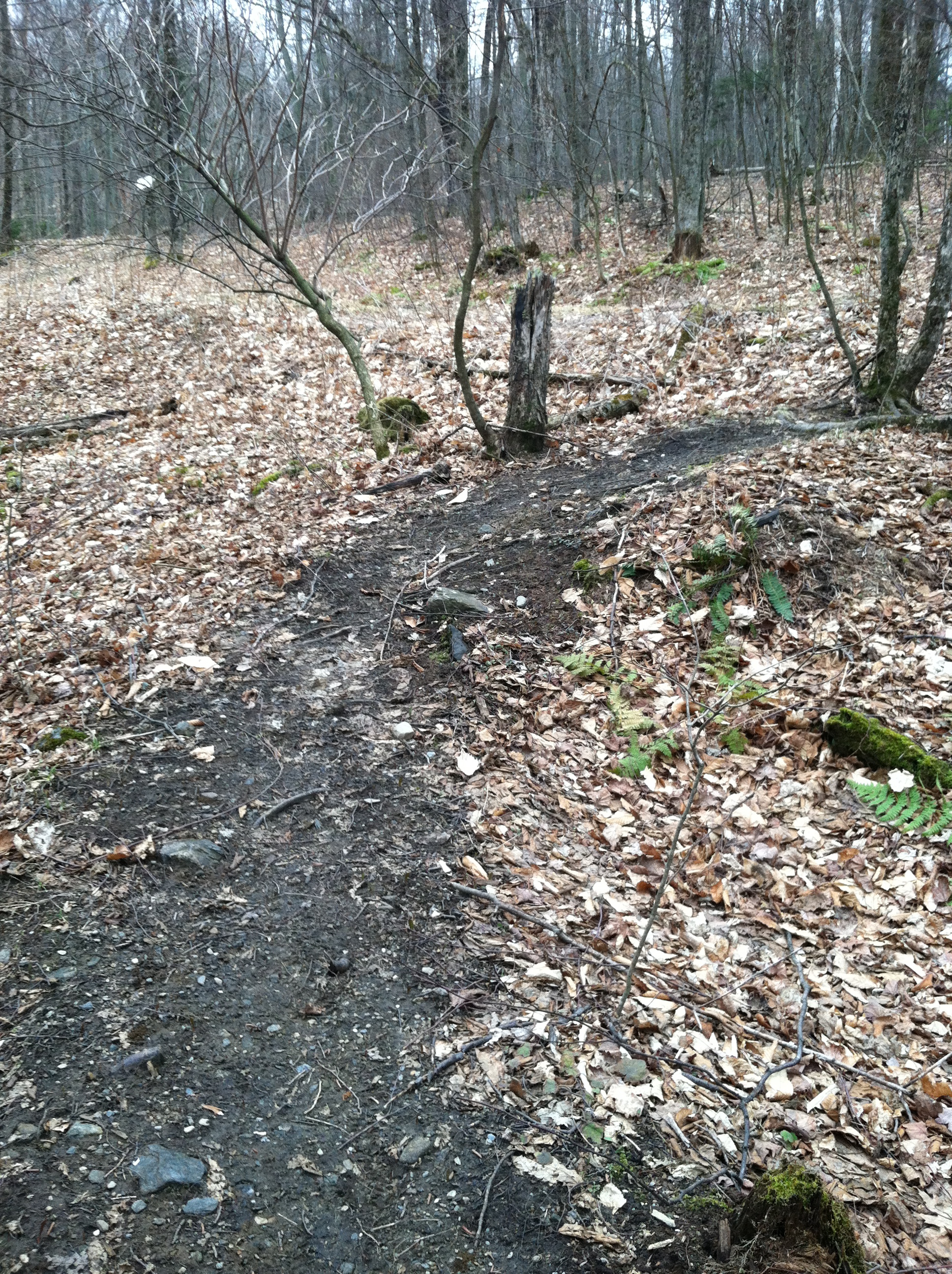 The steady uphill after the 2 mile mark is a wide trail covered with lots of low grass and some leaves.